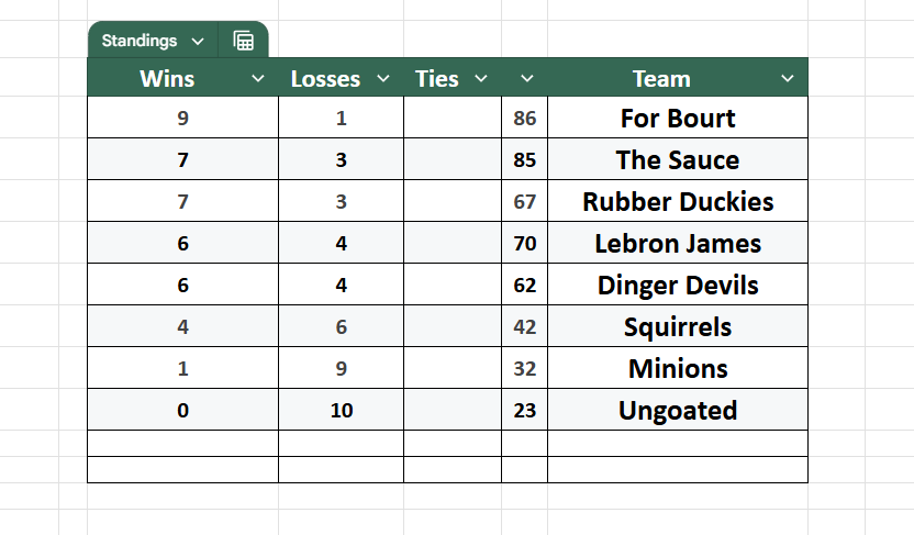 Mid-League Team Standings (Ages 12-14)